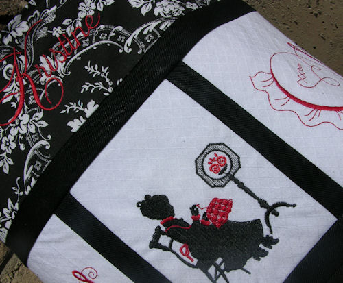 She wanted the bag black and white with some red on it. I had some left over white fabric from making the baby's blessing dress and I thought it was perfect with the crossing pattern on it.